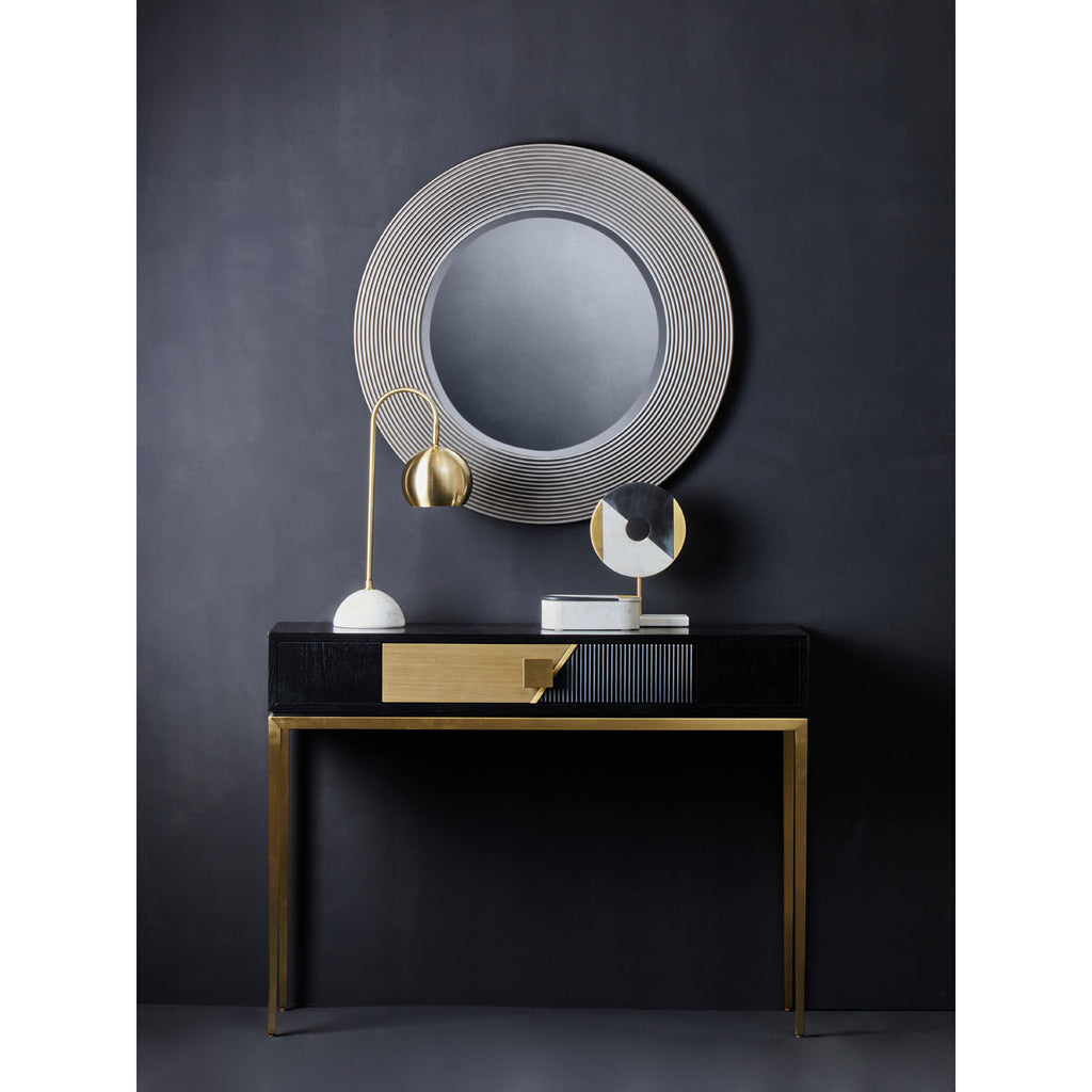 Bring a geometric effect in your room with Davoli console table featuring two tones and diagonal designs. The grains of the grey side are subtly contrasted by the fluted black side. The console table is complemented by gold finished handle and a solid base.